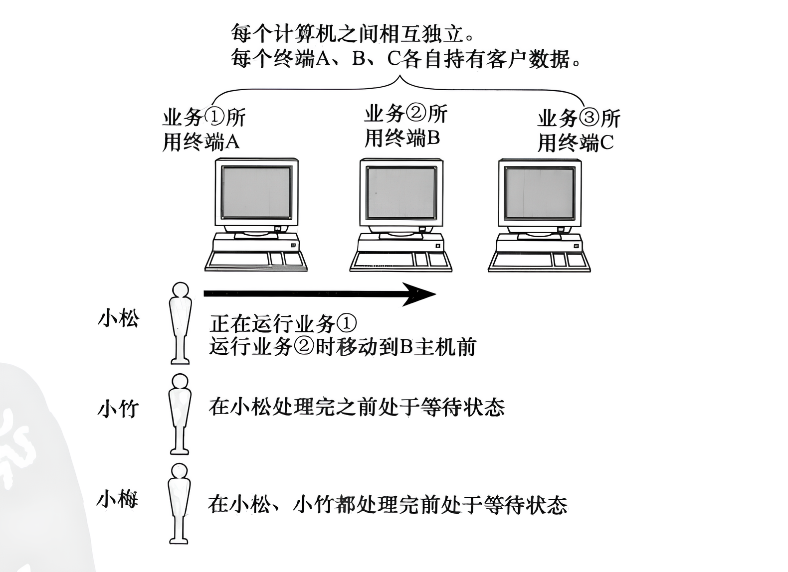 - 特点:每个终端(A/B/C)“各自为战”,业务 ①/②/③ 的数据只存在于对应终端;人(小松、小竹、小梅 )要切换业务,必须 “物理移动” 到对应终端前,且需等待前一个人用完(串行处理)。