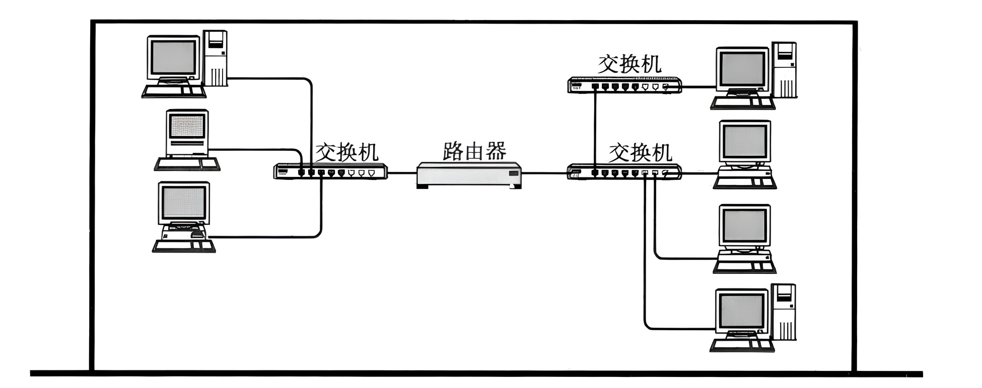 - 特点:用交换机连接 “同一区域内的设备”(如一个办公室 / 楼层),再通过路由器实现 “不同交换机间的连接”;设备数量突破 “几台” 的限制,形成 小规模、本地化的网络集群。