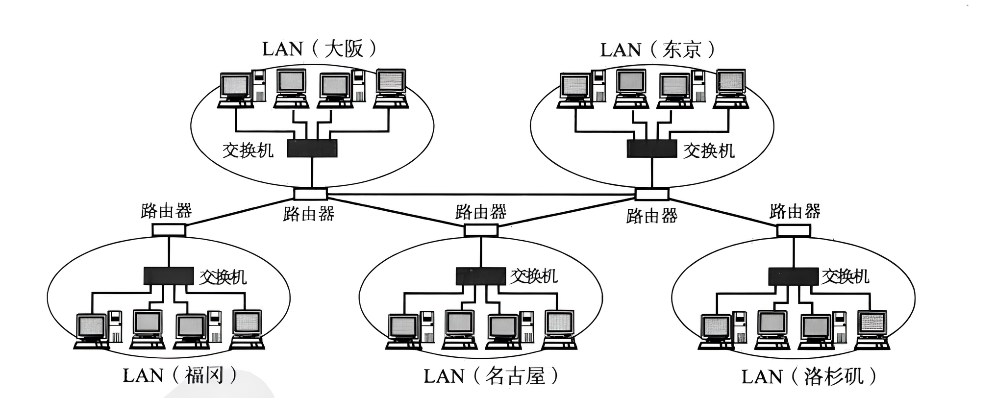 - 特点:用路由器连接 “不同地域的局域网”(如大阪、东京、洛杉矶的 LAN),形成跨城市、跨国家的 广域网络;“局域网” 和 “广域网” 的边界被模糊(本质是 “更大范围的连接”)。